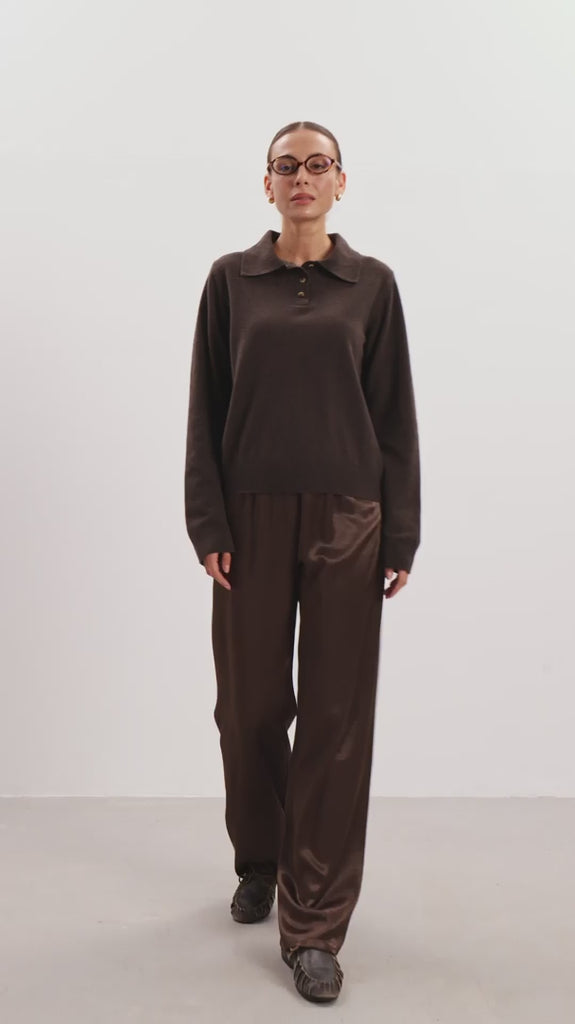 This lightweight knit is made from a soft cashmere blend. It features a neat collar with a short buttoned placket and a clean, straight fit. The hem is slightly shaped for a more defined silhouette, while fine ribbing at the cuffs and bottom adds structure. An easy, refined piece for everyday layering.